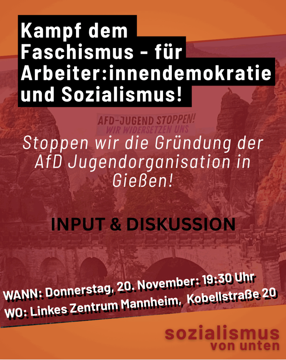 Linkes Zentrum Mannheim Kobellstraße 20, Mannheim, GermanyStoppen wir die Gründung der AfD Jugendorganisation in Gießen!INPUT & DISKUSSION Stoppen wir die Gründung der AFD-Jugendorganisation!Warum ist der Faschismus eine besondere Gefahr, und warum speziell die AfD? Wie stehen...