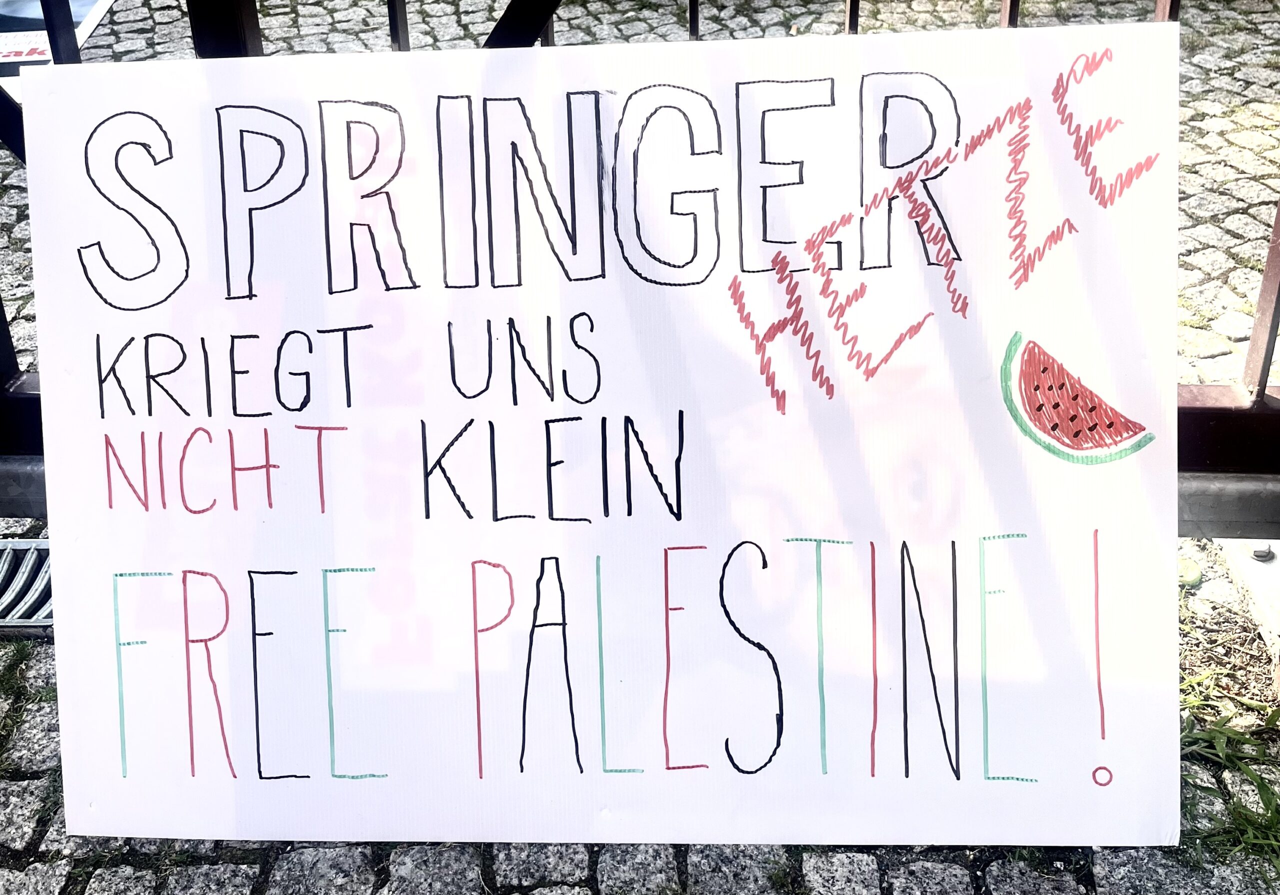 Unbeirrt kamen um die 500 Teilnehmende in Solidarität mit Palästina zusammen. Die Gäste spiegelten die Vielfalt der Gegend und Nachbarschaft wider. Kinder migrantischer und nicht-migrantischer Familien malten und bastelten gemeinsam. Jung und alt tauschten sich bei frischen Wassermelonen, Falafel und gekühlten Getränken aus. Eine ausgelassene und vertraute Kennenlern-Atmosphäre entstand. Infostände, Banner, Plakate und Reden positionierten sich gegen den Völkermord in Gaza. Zwischen Gedichten aus Gaza und Redebeiträgen der Jüdischen Stimme, des Vereinigten Palästinensischen Nationalkomitees, der Linken, des Gazakomitees und anderer spielte ein Violinist die Internationale, »Bella Ciao« und weitere linkspolitische Stücke. »Springerhetze kriegt uns nicht klein. Free Palestine!« malten zwei Jugendliche triumphierend auf ein Schild.