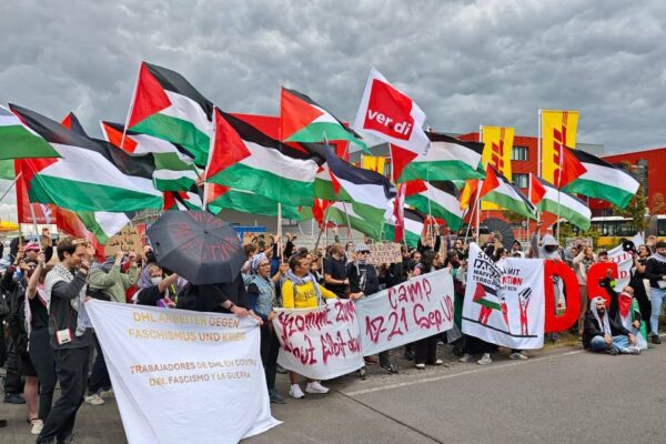 Am 23./24. August fand der March to Airport Halle/Leipzig statt. Rund 700 Menschen sind von Leipzig zum Flughafen LEJ gelaufen, um gegen die Waffenlieferungen von dort nach Israel zu protestieren und mit den Arbeiter:innen vor Ort ins Gespräch zu kommen.