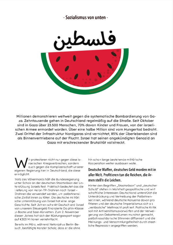 Flugblatt zum Petitionsaufruf gegen die deutsche Unterstützung von Israelischen Verbrechen in Gaza