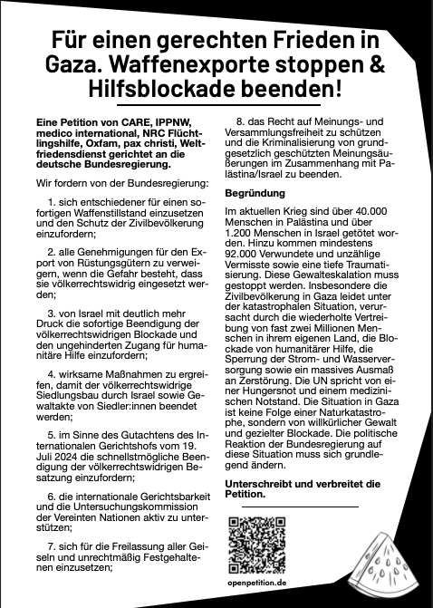 Für einen gerechten Frieden in Gaza: Waffenexporte stoppen & Hilfsblockade beenden!