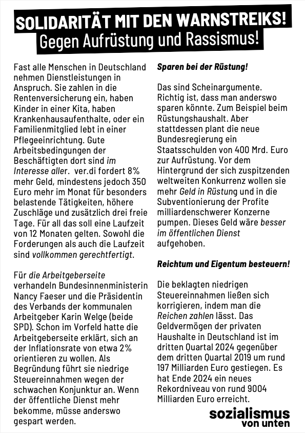 Solidarität mit den Warnstreiks! – Gegen Aufrüstung und Rassismus!