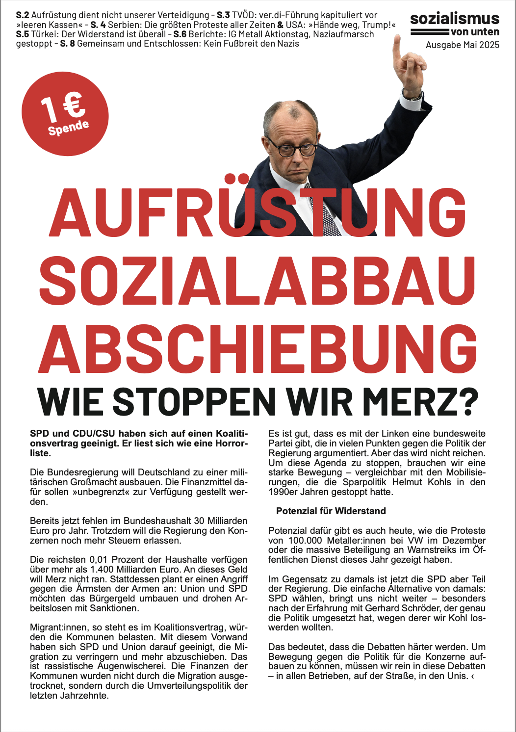 S.2 Aufrüstung dient nicht unserer Verteidigung – S.3 TVÖD: ver.di-Führung kapituliert vor »leeren Kassen« – S.4 Serbien: Die größten Proteste aller Zeiten & USA: »Hände weg, Trump!« S.5 Türkei: Der Widerstand ist überall – S.6 Berichte: IG Metall Aktionstag, Naziaufmarsch gestoppt – S.8 Gemeinsam und Entschlossen: Kein Fußbreit den Nazis